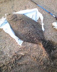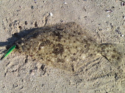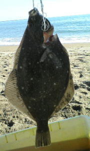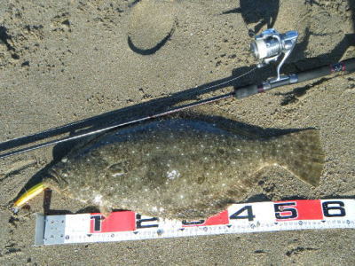 | ベイトも少し居て狙いどうり最干潮前に来ました。 | 今年初ヒラメ!波打ち際で波過してたら重くなり生命反応!マゴチかと思った・・・ | |||