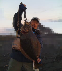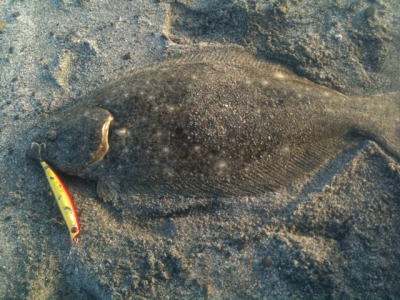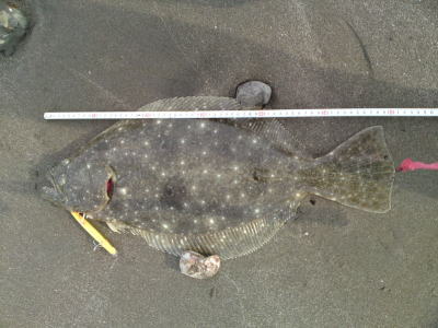 | すぐ隣でやってたカニ網師の、カニ網を引っ掛けたと思いました。ズーンと重かったです。寄せ波でルアーを咥えたヒラメの姿を見るまで、ずっと、カニ網ひっかけたとぶつくさひとりごと文句言ってました。 | 通いつめてやっと今期一匹釣れました。渋い状況の中での一匹でした。 | |||