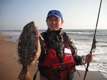 | ”もつさん””Sino君”と同じチームに所属しています。よろしくお願いします。 | 人生初ヒラメ!・・・というか40cmオーバーの魚を釣ったのは初です!(チーム・釣り無双所属) | |||