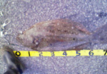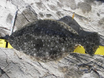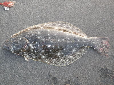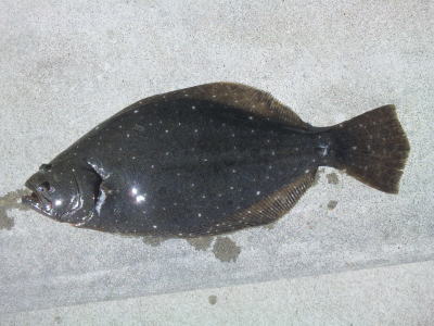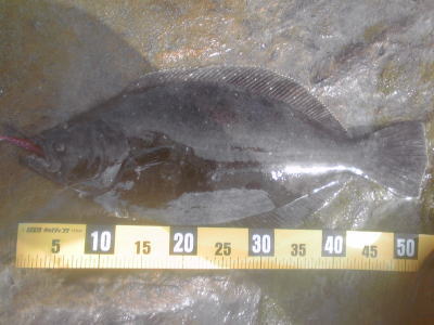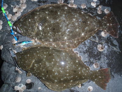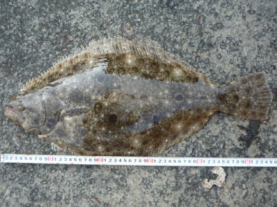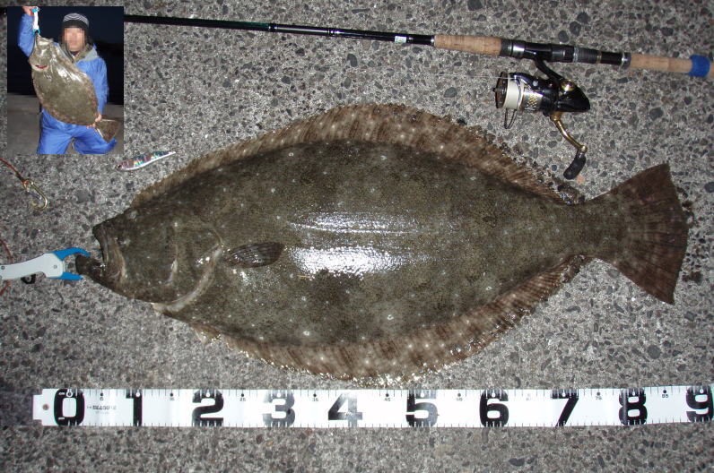 | - | 今年初ヒラメです。岩場で玉網が無かったので抜きあげました。 | |||