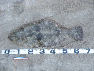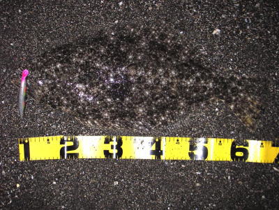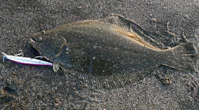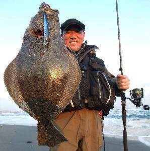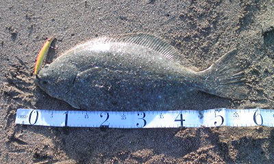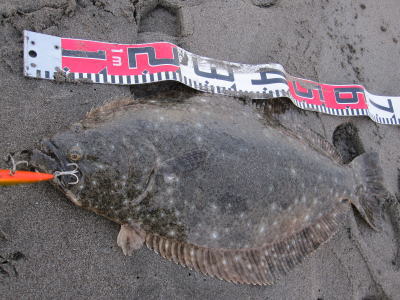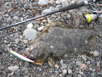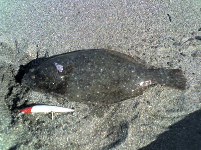 | 今年の初ヒラメです。茨城県北がホームです宜しくお願いします。 | 今年の運を使い果たしました。シーバスと違って波打際で抵抗しまくるファイトは最高です。 | |||