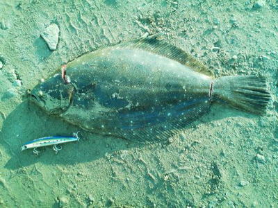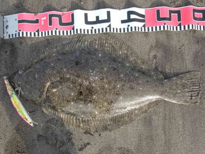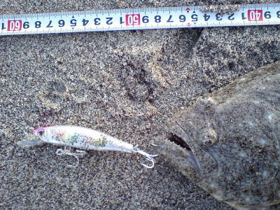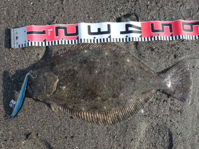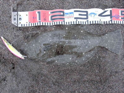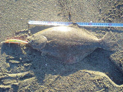| 連敗脱出のうれしい一匹でした。 | 年末まではマゴチばかりでしたが、やっとヒラメに出会うことができました & 同じポイントでヒットした、ぎりぎり40超のヒラメです。この日はサゴシの猛攻に会いルアーがボロボロになりました。(涙) | |||