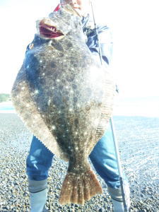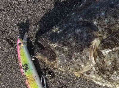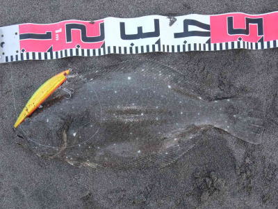 | ひらめサイズと呼べるのは人生3枚目。離岸流と根が絡んだ場所にて。大幅記録更新です。 | 去年の秋から本格的にヒラメを狙い始めて、やっとお持ち帰りサイズが釣れました!嬉し〜! | |||
