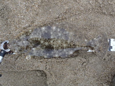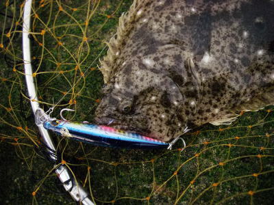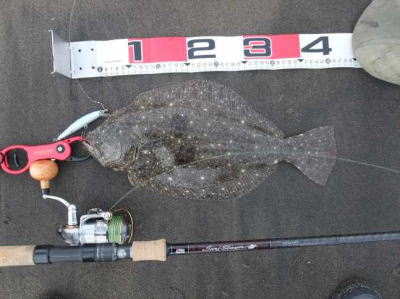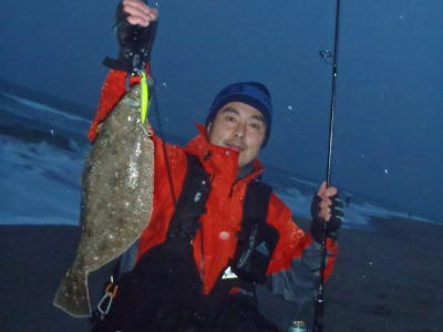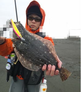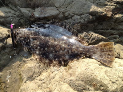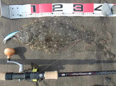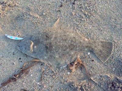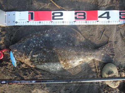 | 今年初のヒラメサイズです! | 2枚続けて足元でバラシてしまい、3枚目でやっとキャッチできました。実績の少ない地元の海で獲れたことが嬉しいです。 | |||