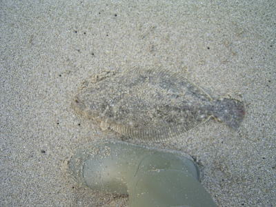 上がってきたのは、ギリッギリのサイズ。たぶん、ソゲ。でも、一応メジャーを当てて、単にソゲなことを確認してみたりする。ま、『釣れただけいいか』と、リリースして、その後もその近辺を狙ってみたけどアタリなし。ヘビサやGUN吉で沖目を探ってみたけど、沖目でもアタリがないので車へと撤収。