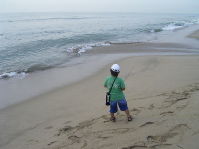 で、子供の安全を考えながら、どこで釣りをするのがベターなのかを考え合わせ歩き、大体の雰囲気をつかんだところで、とりあえず一人で釣り開始 (^^) |