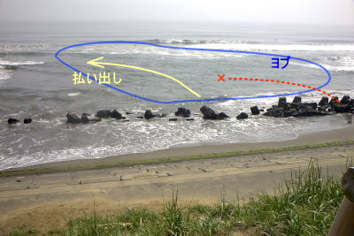 | 平成15年5月4日 ヒラメの春シーズンが大洗にやってきたようなので、今回は大洗に釣行した。 朝マズメ、付近では一番のヨブにO氏と入った。O氏はジグヘッド、私はダウンショットで攻め始めた。流れは、ここ本来の強さで流れていて、なかなかいい感じ。難を言えば、ヨブの境目がはっきりしすぎているという点だろうか。もう少し、タルミにあたる部分が多くてもいい。 しばらくすると、O氏のに何かがヒットした。結構ロッドが曲がっている。 私は、タモを肩からはずし、O氏のもとにゆっくりと急いだ(こうしないと、危ないのね)。しかし、私が付く前に、ロッドのテンションがなくなってしまった。 私は、キャストミスで、リグを『バツン』とやってしまったタイミングで、オリジナルカラーのチューンドK−TENシンキングをリーダーにセットした。 turikitimasaoさんが、私たちのところにやってきたころ、私にヒット。タモ入れをturikitimasaoさんにお願いして、ランディングしてもらうと、50cmほどのシーバス。 またしばらくすると、岩さん、ひらぼうさんがやってきた。そして、今度は、ゴン太さん&ご友人がやってきた。ちょっとだけ、話をして、そのタイミングで、場所移動。 ヘッドランドでは、私のほかに、O氏、岩さん、ひらぼうさんが竿を出す。北側は、程よい流れがあるが、南側はちょっと波が高く、ヘッドランド際にきれいな流れができていない。4人で、ヘッドランド周りのいろいろな場所で竿を出したが、結局、O氏がソゲとシーバスを釣り上げただけに終わった。 ヘッドランドからの帰り、かなり潮の引いたサーフで竿を出す。そして、行きには、潮が満ちていたために竿を出せなかったヨブ(写真)を念入りに攻めてみることにした。もうかなり陽が高く、10時ごろだろうか、、、 潮色は、流れに乗って砂が流されていてちょっと濁っている。ヨブのかけ上がりに沿っては、沖に向かって結構早い払い出しができていた。やや濁り&太陽はかんかんに照っているので、アスリートFのオリジナルカラーを選んだ。 どれくらい投げたろうか?流れの心からリトリーブしてきたルアーに、 『グンッ』 とテンションがかかった。ヒット。時間的に、ヒラメだろうと思っていたのだが、見えてきた魚体は、またもシーバス。47cm。 夕方は、朝一のポイントでもくもくとキャストを繰り返したが、ヒラメからのアタリはなかった。 夜、SUZUさんと久慈側へリバーシーバッシングへ行った。ここでは、SUZUさんの1バラシで終了。アタリがないので、日立の港にメバリングに。 ここでは、SUZUさんが何匹かのメバルを釣り上げたが、私は1バイトに終わってしまった。