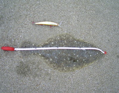 と、まさに狙っていたポイントの波打ち際のカケアガリで押さえ込むようなアタリ。その一瞬はリトリーブを止め・・・・・・すると、グゥッっとティップが持っていかれた。その瞬間にグッとアワセを入れる。すると、しっかりと重みが載ってHITした。が、上がってきたのはまたもや微妙に足りないソゲ