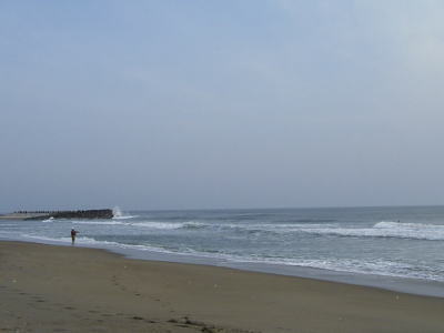 で、タイドミノーLDを改造してシンキングにしたルアーでそんな場所を探り当てた。そこはつまり縦への流れがある場所。左からの流れ、波打ち際と沖の瀬の間を流れる右からの流れがぶつかって、瀬のカケアガリに沿って沖への流れを生んでいる。 |