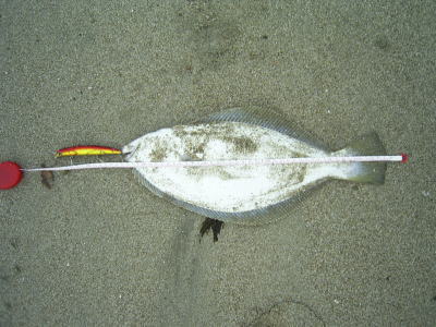 と、ズリ上げた直後、そのヒラメが口からイワシが吐き出した。ヒラメを釣り上げて捌いた後、その胃の中を見てみると意外とカラッポなことが多い。私は、ファイト中に苦しくて吐き出すもんだと思っていたが、コレを見て、『やっぱそうなんだ』と認識した。 |