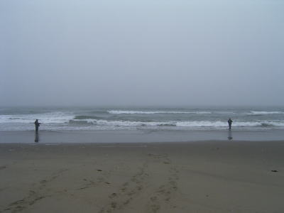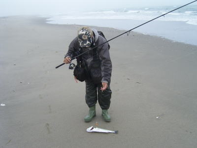 とりあえず夜はアジングして、小メバのみ、寝て起きてサーフに立つと、アラ?意外。予想以上にアングラーが居て、