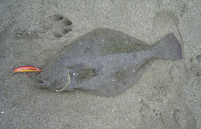 しっかりとアワセを入れ、ファーストラン?をしのぎ、ヒラメの横移動に合わせながら自分も移動して寄せる。そして、波打ち際のカケアガリでセカンドラン。引き波が相まって、重〜い! (^〜^)