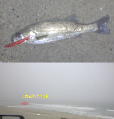 | 平成15年6月8日 水曜に行ったばかりなのだが、岩さんがナイスサイズを上げたことに影響され日曜日、急遽出撃! しかし、まず奥さんの了承を得なければ、、、 『明日行っても良いかな?釣れるときに行きたいんだけど、、、』 『水曜行ったばかりじゃん』 『だよね、、、』 その後数時間、悶々とリールをメンテナンスする。と、その時、ニュースで来週から入梅と報じられた。 『来週から入梅だって。釣りに行けなくなちゃうかもな〜。行けるときに行きたいなぁ〜』 ・・・ 『来週と再来週は行かないからさ、、、』 〜〜〜〜〜〜〜〜〜〜〜〜〜〜〜〜〜〜〜〜〜〜〜〜〜〜〜〜〜〜〜〜〜〜〜〜 ということで、快諾してもらい、釣行へとあいなった。 あまり潮は動かないが、下げ一杯前後の朝マズメを考慮し、午前3時、サーフにたつ。北東の向かい風が少し強いものの、この強さならミノーでも釣りができると判断し、タイドミースリム レッドシャイナーをセットした。 潮は、左から右に流れ、沖へと払い出しているようで、途中リトリーブが重くなり、ルアーは、かなり右から返ってくる。 薄っすらと明るくなってきて、潮の流れが確認できた。狙う範囲は狭く、約30m。この範囲を数投しては移動するラン&ガンで攻めつづけた。 そして1回目のヒットは、『やけに多いよ』と聞かされていたセイゴ。フックを外して、海にお帰りしてもらった。 この頃になると、風が強くなり、霧が出てきた。次第に、ミノーでは思ったところにキャストができなくなり、ミノーよりは風に強いダウンショットリグに変更する。セットするルアーには、パワーシャッド5インチのパールホワイトを選んだ。というより、使いたい4インチ ピンクグローバックの在庫がなく、『仕方がないか』ということでのチョイスだ。 ダウンショットに変更したことで、飛距離が伸び、ブレイクの後ろまでルアーが届くようになた。 再び、ラン&ガンを初めてしばらくたったころ、『グィン』とロッドに重みが伝わってきた。 癖になっているのか、聞き合わせを入れ、やっぱり重いので、大きく合わせを入れた。生体反応あり、ヒラメのからのものだ。 ロッドを寝かせ、リーリングする。波打ち際で、引き波にさらわれるも、次の寄せ波でズリ上げた。 ルアーをくわえてる写真を撮ろうと構えたところで、フックが外れ、撮れなくなってしまった。仕方が無いので、そのままパチリ。 その後は、ヒラメからのアタリはなく、波打ち際で、セイゴがヒットしただけ。風が強いのと、時合いが過ぎたと判断し、午前の部終了。 昼寝の後の午後は、干潮前後を意識して竿を出す予定だったが、風が朝よりも強く、しまいには、またまた霧が出てきてしまい、竿を出す気力がなくなり、撤収。 こんなことなら、すぐに帰ればよかったと思うのでした。