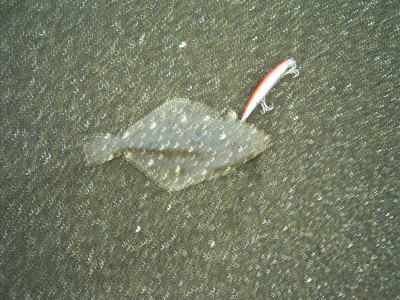 『おおぉ〜!今まで見たジャンプヒラメの中では、一番でかいわ (^^;)』 などと、感動する。比較的、魚運のない私、だからイワシバホバホの状況も見たこと無いし、ヒラメのライズっちゅ〜ヤツも見たこと無い。なので、ソゲのジャンプでも感動してしまうのです (-.-)