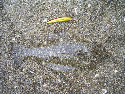 と、ヒラメじゃないような引きにとまどいながら、やりとり&寄せ波でズリ上げ ε=(/*~▽)/