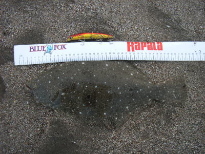 その後、ちょっとやりとりを楽しみズリ上げると、ソゲよりはちょっと大きめのヒラメ (^¬^) やりました、久々の房総寒ビラメです。