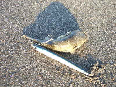 次のポイントは、駐車スペースからポイントまでが遠い遠い ( ´ρ`) 片道20分以上のエッチラホッチラの末、絶妙な離岸流をあの手この手で攻め倒すも、私の腕ではクサフグを掛けるのが精一杯。 |