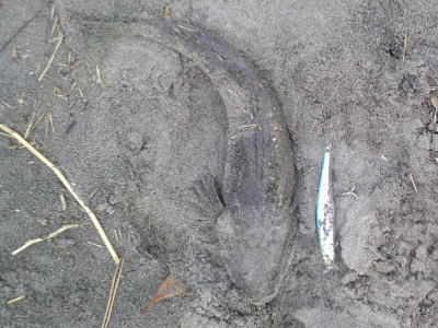 ヒラメじゃない、なんだ?シーバスでもない・・・と、考えてる間にズリ上げ完了。正体は、マゴチでした (^^) |