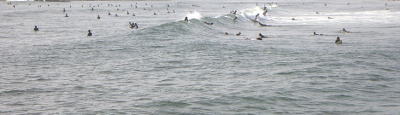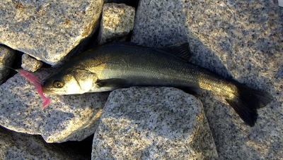 | 平成15年8月3日 人が多い、釣り人が多い、サーファーが多い、駐車スペースがない、そして暑い!そんな状況の大洋村〜鹿嶋間のヘッドランドをいくつか叩いた後、ひらぼうさんにアドバイスをもらい、叩いていないヘッドランドに向かった。 ![]() 着いてみると、ひらぼうさんの言う通り、人が帰り、駐車スペースが空いている。雰囲気から、そのスペースは、もううまらないだろうと判断し、まずは、ひとつ北のヘッドランドを偵察。こちらも問題なく駐車でき、土手の上から海をチェックした。 しかし、そこのヘッドランドは、流れが弱く、いまいちの状況。そこで北のサーフに目をやると、大きなヨブが目に入った。 『あの大きさなら、一匹はいるでしょ。あの場所なら、朝から誰も叩いてないし。』 と思い、暑い中、ナイロンウェーダーを履き、ヨブへ移動した。ヨブには、南から北への横流れがあり、沖へと払い出している。私は、払出しの南側を攻めることにした。風が右後方からやや強めに吹いているためか、ダウンショットリグがいつも以上に良く飛んだ。最近、ようやくキャストのコツを覚えたため、以前より10mは余計に飛んでいるように見える。 時折、波の中に30cmほどの魚(たぶん、ボラ)の影が見え、魚が寄っていることを予測させるが、1時間以上粘っても、そのポイントからアタリを得ることはできない。波が、上げ潮のため混んできて、帰り道が危うくなってきたので、後ろ髪をひかれつつも撤収した。 そして、先ほどのヘッドランドに戻ってみると、予想通り駐車スペースがあり、先ほどよりもいい感じの流れになっていた。さらに、一番いい場所に入られているが、釣り人はひとり、十分楽しめると判断し、ヘッドランドに向かった。 しかし、広いポイントを順に探っていくものの、反応はない。最後は、ラン&ガンをやめ、その釣り人(ヒラメのエサ釣り師)の後ろで粘ることにした。 2つのダウンショットをロストし、持っていたダウンショットのタネも尽きたので、AXヘッド+パワーシャッド 5インチ ピンクグローバックをセットした。底を取り(流れが強いので、難しい〜)、ロッドを水平にして、ダウンクロスのため、早めに巻く。たまに、底を取り直し・・・と繰り返すが、全然ダメ。ロッドを立て、やや遅めにリトリーブ。リフト&ドロップ(フォールではない)など、色々織り交ぜ誘ってみるものの、魚からのアタリはない。 あと30分もすれば、日が沈みきるような高さになったとき、ヘッドランドの際で、根がかりのような感触がロッドに伝わってきた。 『やっちまったか!?』 しかし、ロッドを立てると魚からの反応が伝わってくる。潜るような、押さえ込むようなその反応から、『ヒラメ』と判断したものの、急にエラ洗いをしたその魚は、まぎれもなくシーバス。その後は、なんなく寄ってきて、抜き上げた。 『う〜ん、また君なのね。』 と、最近シーバスづいているのをチョびっとだけ悲しむ。 そして、陽が完全に沈んだところで、明日のことを考えて、撤収。