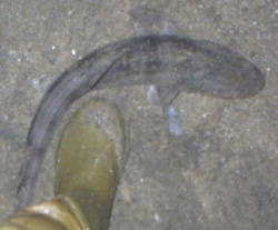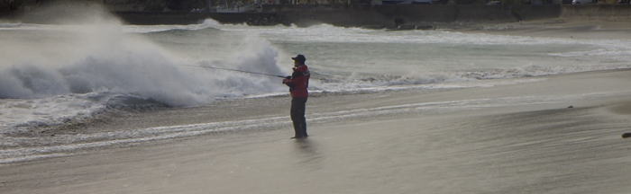 | 平成16年1月11日 今日の天気は晴れ、北西の風強く、波高い・・・さて、どこで竿をだそうか・・・ 『初釣りだというのに・・・』 午前5時、大久保さん、ひらぼうさんと待ち合わせ、たぶん、大丈夫だろうと思われる勝浦のサーフに向かった。到着してみると、いつもよりも波立っているが、十分に釣りになる状況で、ちょっと期待が持てる。 まずは、薄明りのなか、海面を眺め、払い出しを探す。もっとも有力と思われる流れ込み前は、先行者が入っているため、その先にある沈み根の際から攻めることにする。ここも海面の様子からは、弱いながらも沖への流れがあり、移動してきたヒラメが歩みを止める可能性がありそう。 まずは、数キャストしアタリを伺うが、アタリがない。そして数歩磯際から左へ移動しキャスト、さらに、数歩・・・ こうしてラン&ガンすること5〜6回目、『グンッ』っときた。 『来たっ!』 アワセを入れ、ロッドを水平にしたまま巻いてくる。引きは、シーバスのようではなく、ヒラメのような引きに感じられる。 『ん!?結構引くな・・・50cmくらいありそう』 そして、波打ち際近くに来たとき、まだやや暗い水の中にシルエットが見えた。 『な〜んだ、マゴチか。』 しかし、サーフにズリ上げ、確認すると、それは50cmぐらいのサメ。テールフックにしっかり食ってる。
