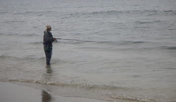 勝浦のサーフは、やや千切れ海草が多いのがやっかいだが、水は澄み、波は穏やか、ベイトもいる(O氏&うみんちゅさん)という絶好の条件。 そして、夕方、ルアーをダイトミノスリム120のゴールド&グローに交換し、1キャスト&1歩移動のラン&ガンを始めた。根があるため、いつもよりロッドを立て、少し遅めにリトリーブする。 数十m移動し、沖の根の上からゆっくりとリトリーブしていたとき、『ぐゅいん』とロッドがしなった。 『きたっ!!』 しかし、その瞬間にテンションが軽くなり、意気消沈。 『ルアー交換かそれともこのルアーでいくか???』と『今のは、魚?根掛り?海草?』と2つの考えが交錯する。 まずは、このままのルアーでキャストをし、リトリーブしながら考えた。 『根ならば、また根掛かるはず・・・』 『海草にしちゃ〜、今日はそんな大きなヤツあまりないし・・・』 と考えながら、左右を攻め続けるものの、同じようにロッドがしなることはなく、ルアーを変えてもアタリがないので、再びラン&ガンを開始した。 しばらくすると、サーフ中央で粘っていたO氏、うみんちゅしとも上がってきたので、そこで終了とした。