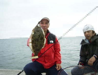 見ると、ロッドが綺麗に曲がり、ヒラメがかかった模様。すかさずタモ入れ職人は、タモを構え、私はカメラを取りに動く。残念ながら、カメラを構えたとき、ヒラメはタモノ中。さすがタモ入れ職人、仕事をこなすのが早い。