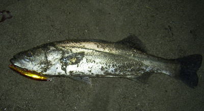 しか〜し、直ぐさまラインが横に走り出し、ヒラメじゃなくてシーバスと確定。2回のエラ洗いをかわし、寄せ波でズリ上げたのは、50オーバーの太ったキレイなシーバスでした。